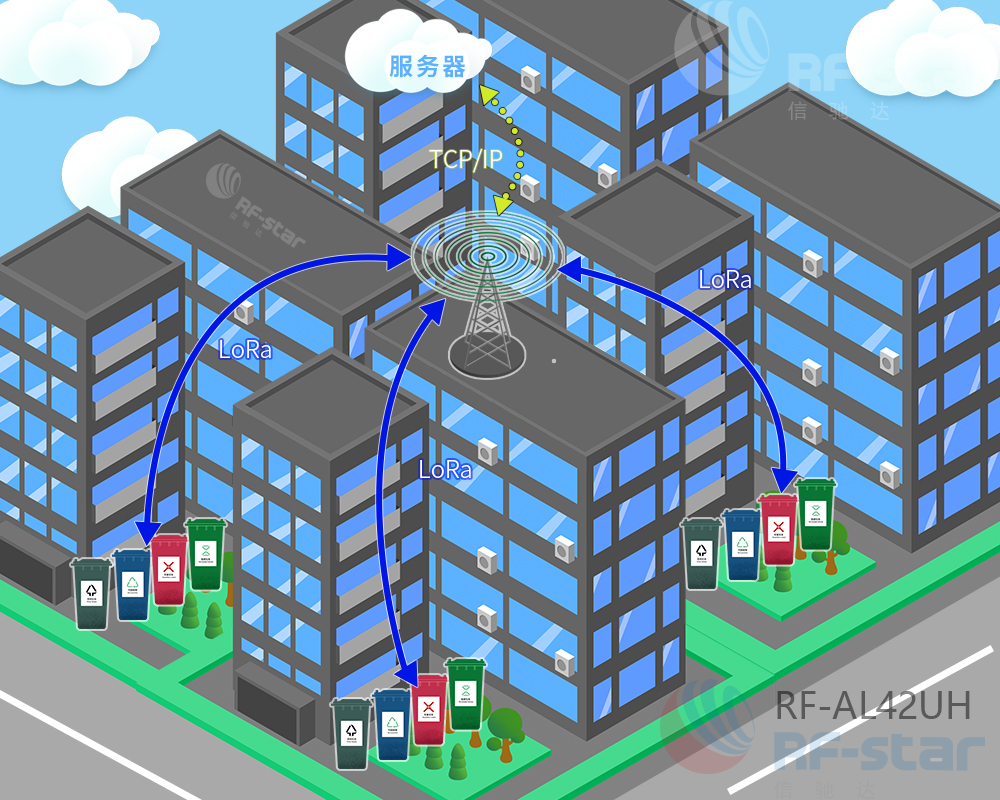 Rf-al42uh module based on Lora technology has a wide application prospect in garbage classification with excellent performance and flexible networking form. In the daily life scene of garbage classification, the garbage cans need to collect some key data in real time, such as the weight of garbage cans, the times of garbage dropping, the accuracy rate of automatic recognition dropping, etc.