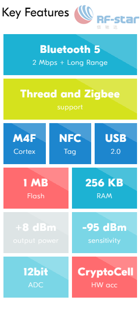 nRF52840 SOC is built around 32-bit arm ? cortex ? - M4 CPU, with 64 MHz floating-point unit, which has sufficient general processing capacity, floating-point operation and DSP performance to meet the challenging wireless application requirements. It has nfc-a tags to simplify pairing and payment solutions. The arm TrustZone ? cryptocell encryption unit included on the chip provides a range of encryption options that are executed efficiently independent of the CPU.