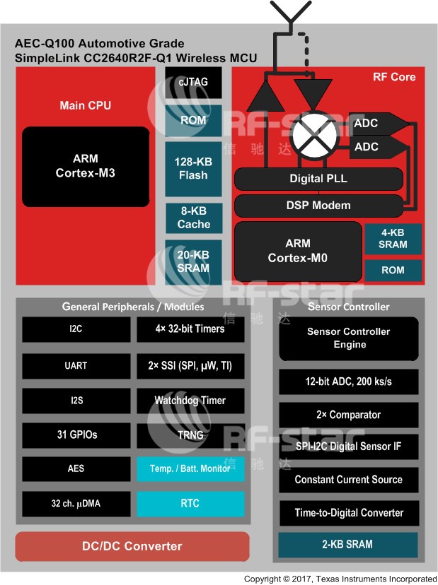 CC2640r2f-q1 wireless MCU includes a 32-bit arm ? cortex ? - m3 processor running at 48mhz as the main application processor, and an RF core arm ? cortex ? - M0.