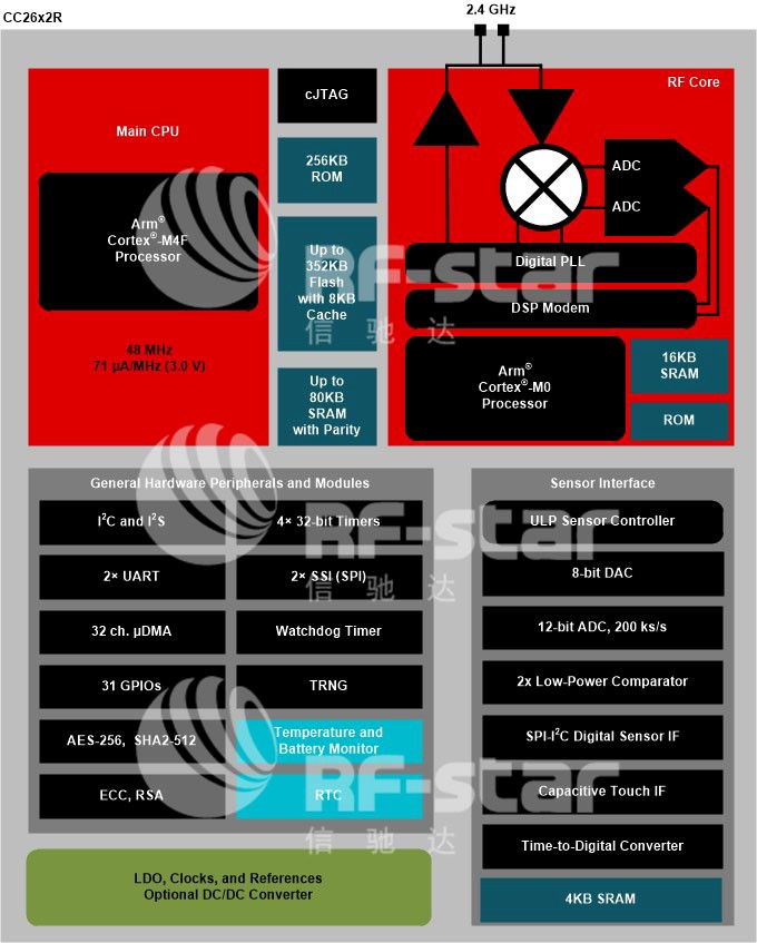 The CC2652r device combines a flexible ultra-low power RF transceiver with a powerful 48 MHz arm ? cortex ? - m4f CPU on a platform supporting multiple physical layers and RF standards. The dedicated radio controller (arm ? cortex ? - M0) can handle low-level RF protocol commands stored in ROM or ram, thus ensuring ultra-low power consumption and excellent flexibility. The low power consumption of cc2652r device will not affect the RF performance. CC2652r device has excellent sensitivity and durability.