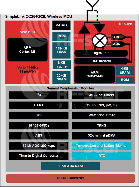 In terms of cores, both CC2640R2L and CC2640R2F are the same: 48 MHz ARM? Cortex?-M3 cores, and they both have 275 KB non-volatile memory, including 128 KB in-system programmable flash, up to 28 KB system SRAM, of which 20 KB is ultra-low leakage SRAM. Compared with CC2640R2F, CC2640R2L does not have a Sensor Controller Engine, so the cost of CC2640R2L is lower and it is more suitable for the application scenarios of basic transparent transmission function.