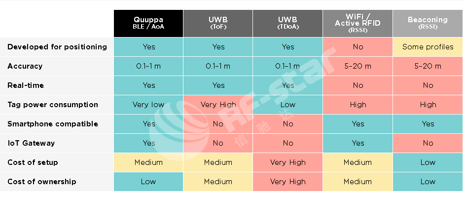 There are four solutions for indoor positioning: UWB, Wi-Fi, BLE beacon / BLE AoA. For the accuracy range, UWB is 0.1 m ~ 1 m; Wi-Fi and BLE beacon is 5 m ~ 20 m with a larger error range. As the first commercial BLE AoA positioning service company, Quuppa can control the accuracy range within 0.1 m ~ 1 m (with the TI CC254x and Nordic nRF5281x chips).