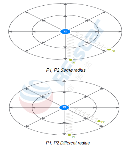 AoA calculation: Supposing that there is a fixed-frequency Bluetooth beacon signal broadcasting in an open area (ignoring obstacles and other 2.4 GHz signal interference in the air). If the two receivers are on the same radius and at the same TX end, at a certain time t, the phase difference received by the RX receiver should be 0. But if the receiver is in a position with an inconsistent radius, at a certain time t, there is a difference in the phase of the RX receiver.