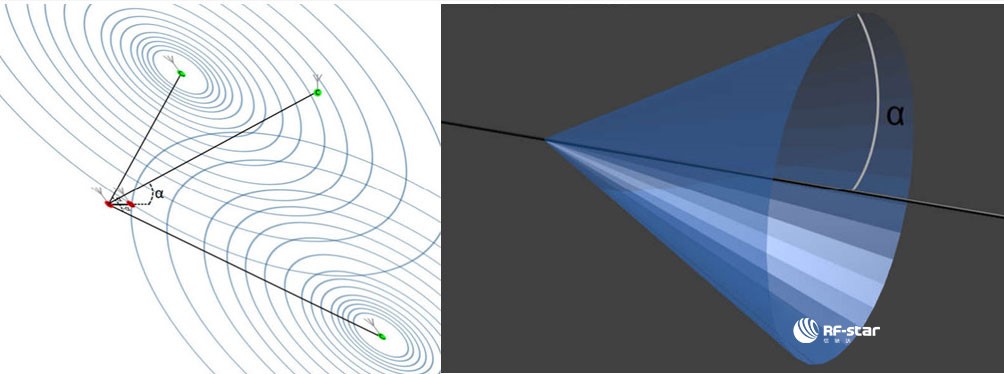 Taking a 2-dimensional plane as an example, there will be two angles of α. And in real three-dimensional coordinates, there will be a trajectory of a circle with a radius of α. The AoA receiver only knows that the beacon signal is on the trajectory of the circle, however, it cannot judge where they are on the circle. At this time, an orthogonal antenna array is needed to confirm the position coordinates of the beacon point.