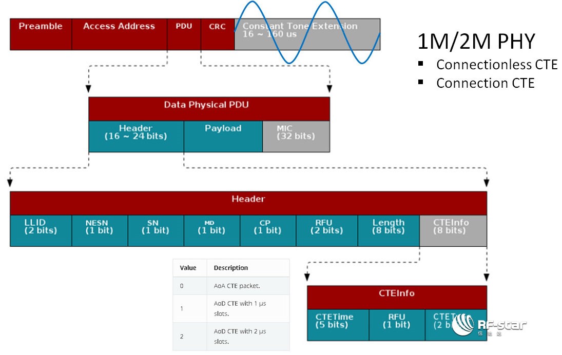 AoA / AoD can work under 1M or 2M regular PHY (coding PHY is not supported) and can support broadcast mode and connection mode. The data transmission format has the following requirements: in the PDU data packet, the AoA/AoD specification is standardized. CTE is the extended data of AoA / AoD data packet, and the duration is 16 μs – 160 μs. The 250 kHz signal modulation is on the carrier wave without whitening and CRC validation. The signal is used by the receiver RX to sample the signal I/Q value at time t and calculate the phase difference.