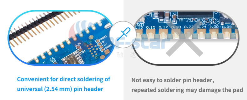 In terms of pins, nRF52840 dongle launched by RF-star technology adopts the convenient and direct welding general-purpose pin header, which can be used on the pin header just by welding. It is convenient for users to carry out secondary development and reduce the R & D cycle. Then look at the stamp half hole used by the original factory, it is not easy to weld the pin headers, and repeated welding is very easy to damage the pad, or even cause the pad to fall off, unable to use. In contrast, the nRF52840 dongle launched by RF-star technology has a longer development life.