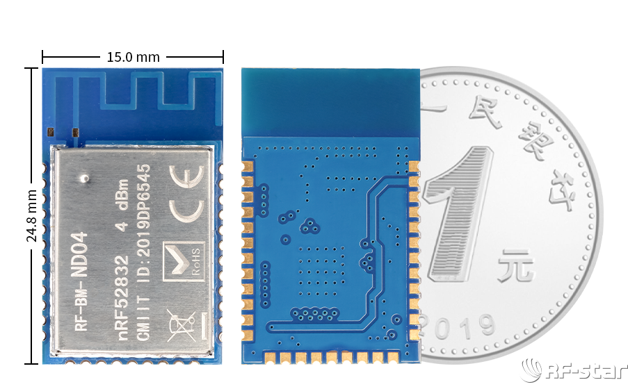 RF-BM-ND04模組是基于Nordic nRF52832芯片開發(fā)而來的,支持BLE 5.0、Proprietary、ANT、NFC協(xié)議,擁有ADC、PDM、PWM、I2C、I2S等多種數(shù)字外設(shè)接口,可在運(yùn)動(dòng)器材、控制器及監(jiān)控設(shè)備等不同的應(yīng)用中工作,應(yīng)用場(chǎng)景廣泛。此外,該BLE藍(lán)牙模塊內(nèi)置默認(rèn)藍(lán)牙5.0UART串口透?jìng)鞴碳?,支持主從一體,一主多從連接模式,方便易用。