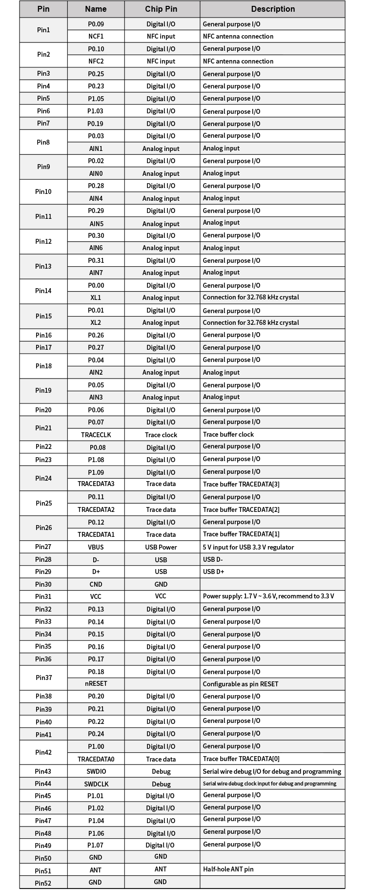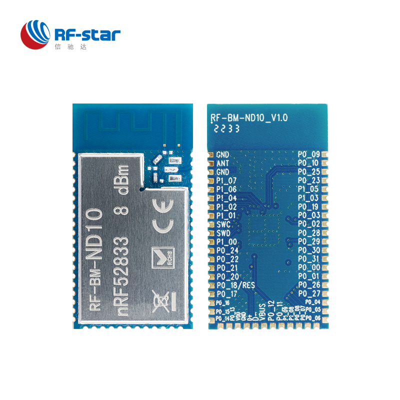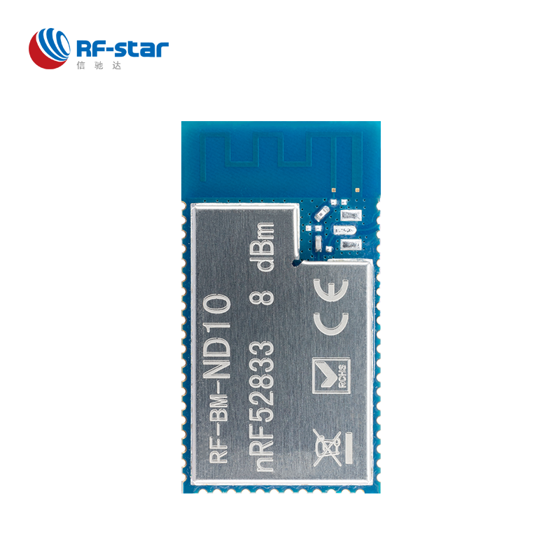 RF-BM-ND10 is a multiprotocol Radio Frequency module based on Nordic nRF52833 SoC. It integrates a 32 MHz crystal, 512 KB Flash, and 128 KB RAM. Its 64 MHz ARM? Cortex?-M4 with FPU core processor can operate at an extremely low current at flexible power modes. Its 2.4 GHz RF transceiver is compatible with Bluetooth 5.3 Low Energy, Bluetooth Mesh, Direction Finding AoA and AoD, Thread, ZigBee and NFC. Up to 8 dBm TX power gives the module a robust coverage range. The module has a wide range of analog and digital interfaces such as NFC-A, ADC, Full-speed 12 Mbps USB 2.0, High-speed 32 MHz SPI, UART/SPI/TWI, PWM, I2S and PDM, which makes it applicable in several applications over USB with low power consumption.